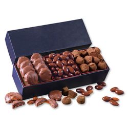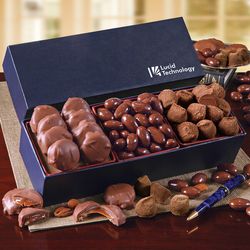 Here you will find the finest premium chocolates nestled within stylish gift boxes. Our navy Gift of Distinction is filled with 8 mouth-watering Caramel Pecan Clusters, made with creamy caramel and full-flavored pecans, approximately 40 of our famous Chocolate Covered Almonds and 11 rich and creamy melt-in-your-mouth Cocoa Dusted Truffles. Nearly a pound of sweet temptation! Your logo is foil-stamped in white on the gift box. Serves 8-12.